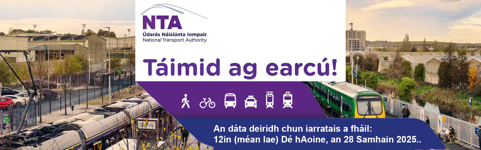 Is eagraíocht spleodrach shíorathraitheach atá ag dul i méid é an tÚdarás Náisiúnta Iompair. Táimid i mbun roinnt mórthionscadail iontacha a chur i bhfeidhm, a bhfuil clár BusConnects, MetroLink, DART+ agus seirbhísí nua iompair phoiblí ina measc in éineacht le teicneolaíocht a thacaíonn le Cártaí Leap, Eolas Fíor-ama do Phaisinéirí agus an t-athrú chuig íocaíochtaí gan airgead tirim in aghaidh seirbhísí.