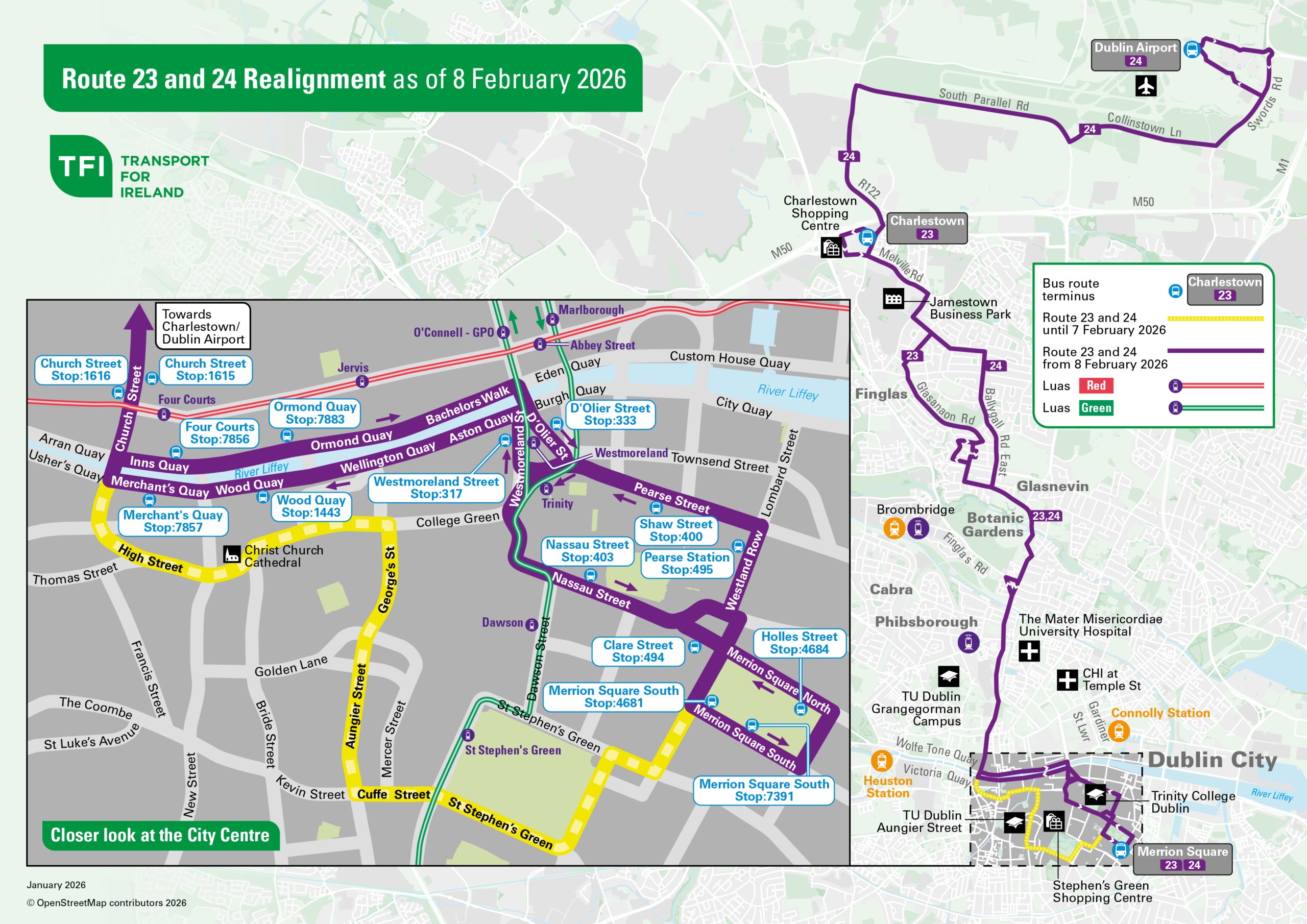 To address this, both routes will now operate along the Quays crossing the River Liffey at O’Connell Bridge, before continuing past Trinity College to their existing terminus at Merrion Square.