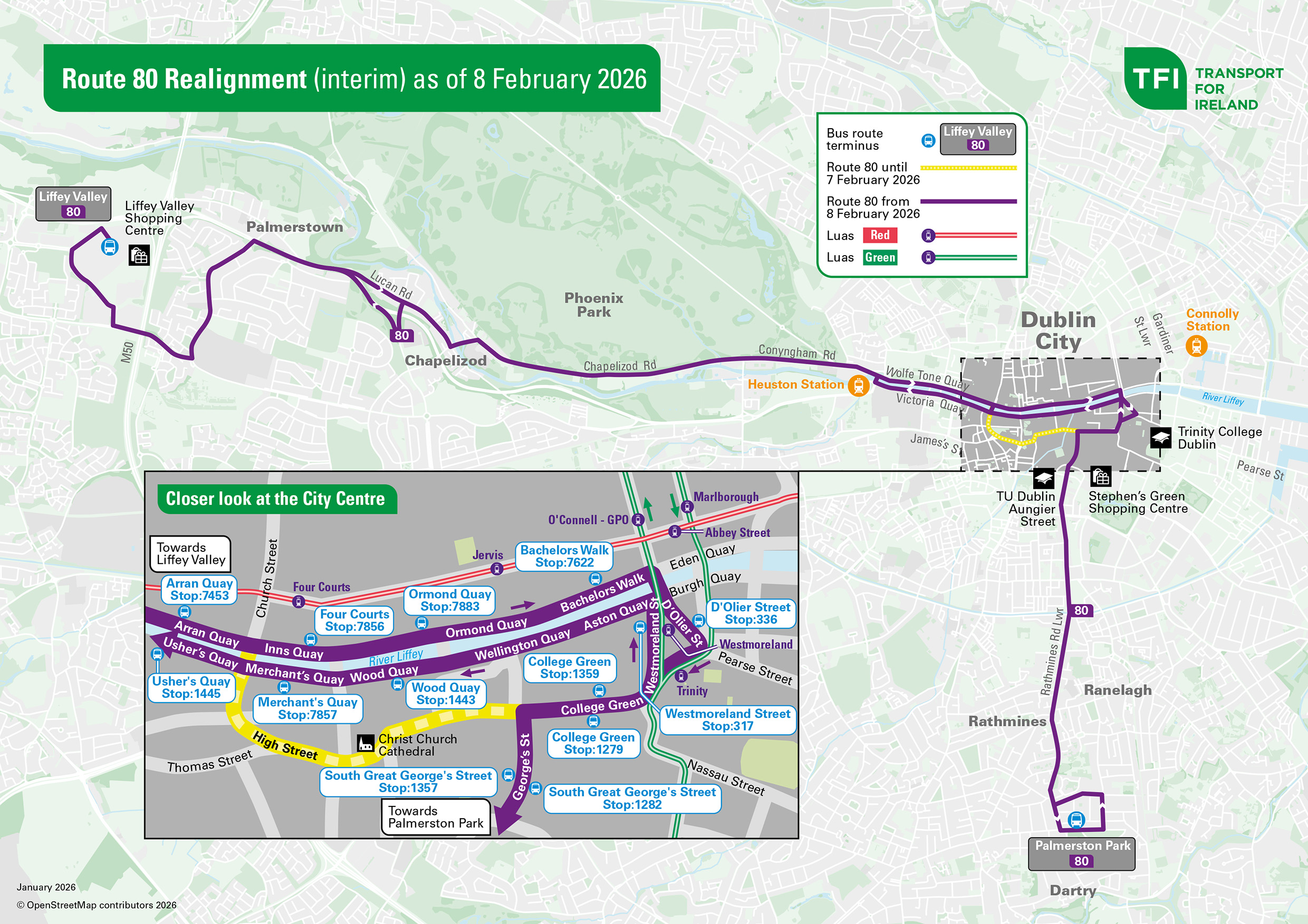From 8 February, Route 80 will operate on an interim basis along the existing Route 80 alignment as far as Bridge Street, then divert to continue along the Quays to O’Connell Bridge, College Green and Dame Street then onto South Great Georges Street to resume its current alignment to Palmerston Park.