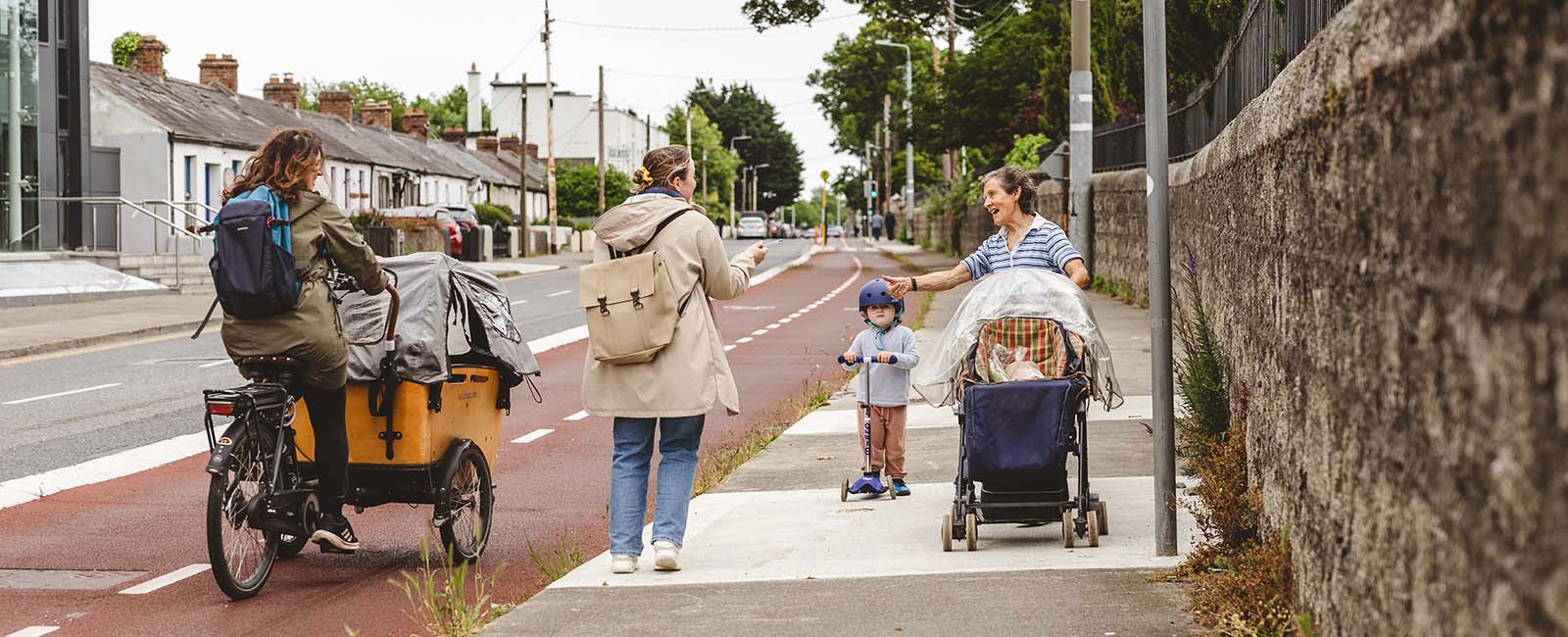 walker on foopath cyclist with carriage on cyclelane and woman with bbuggy and child on scooter 900x600